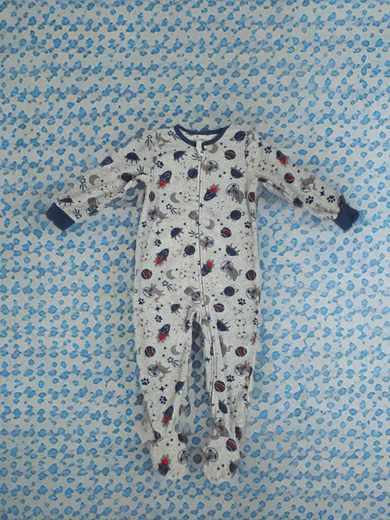 Enterito de bebé con estampa de cohetes, planetas y astronautas. Tiene cuello redondo y cierre al frente.