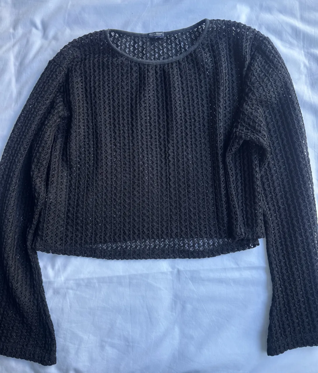 Remera negra de manga larga/Sweater finito con tejido calado y cuello redondo.