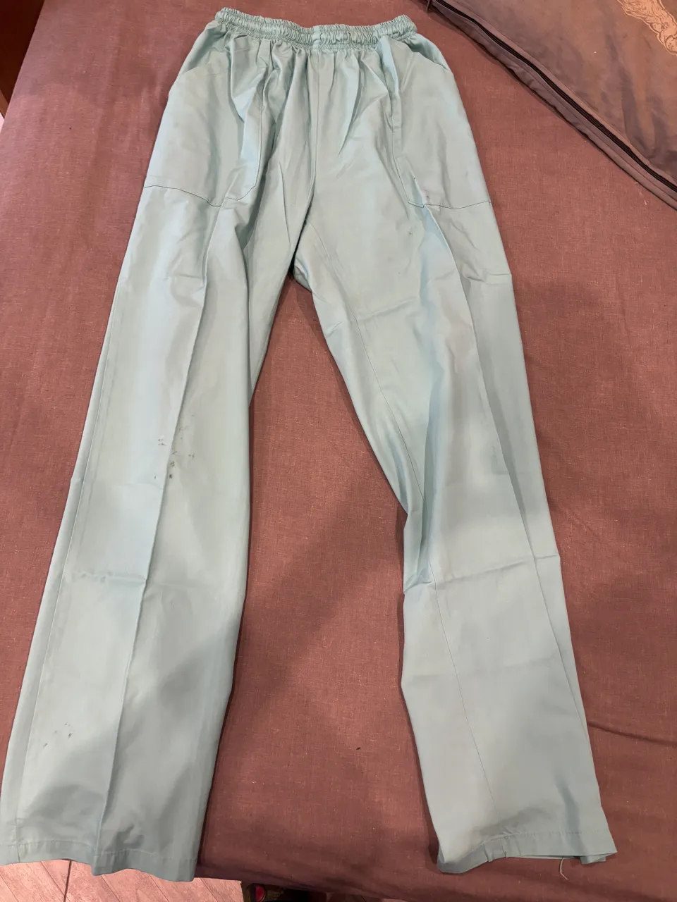 Pantalón de tela color verde claro con cintura elastizada y bolsillos laterales.