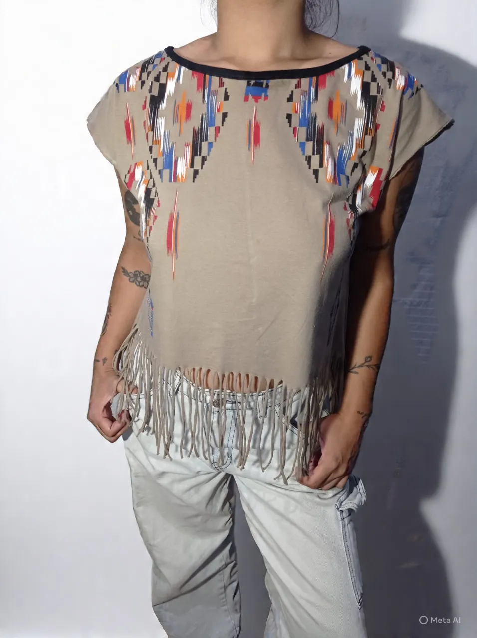 Remera de mangas cortas con cuello redondo y estampa geométrica en la parte superior. Posee flecos largos en el ruedo inferior. El color base es beige.