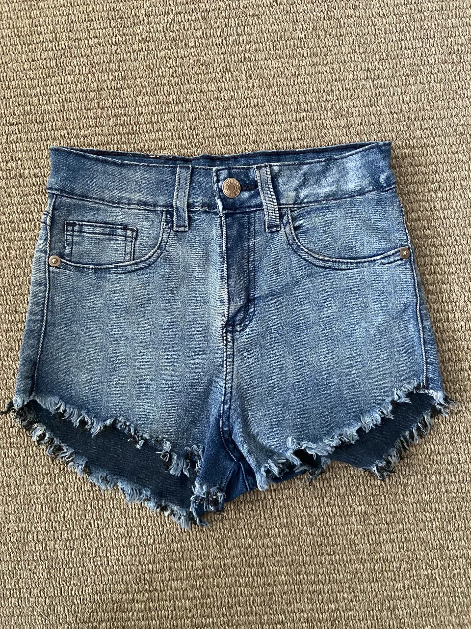 Shorts de jean tiro alto con roturas y detalles desflecados en los bordes. Lavado desgastado y moderno, perfectos para un look casual y canchero.
