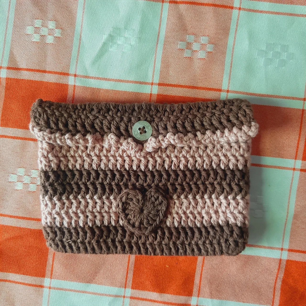 Cartera tejida a crochet, con detalles de corazón y botón. Ideal para llevar tus esenciales con estilo.