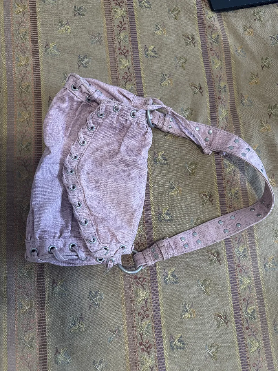 Cartera zara rosa de tela con detalles de ojalillos y cordones. Ideal para un look canchero y moderno. Perfecta para el día a día o una salida informal.