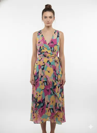Vestido midi estampado floral, con escote cruzado en V, mangas cortas y detalle de volados. Ideal para un look fresco y femenino.