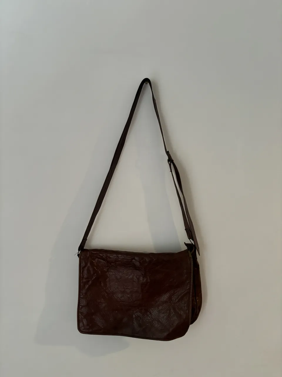 Bolso de cuero marrón tipo morral, estilo bandolera, con correa ajustable. Ideal para el día a día, tiene varios compartimentos internos para organizar tus pertenencias. Un clásico que nunca pasa de moda.