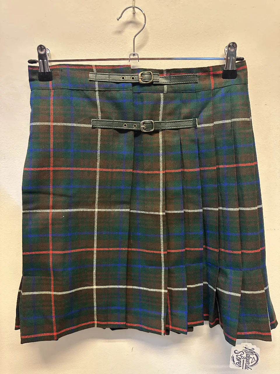 Pollera escocesa con detalles de cuero y hebillas. Diseño plisado y moderno, ideal para un look canchero y con onda.