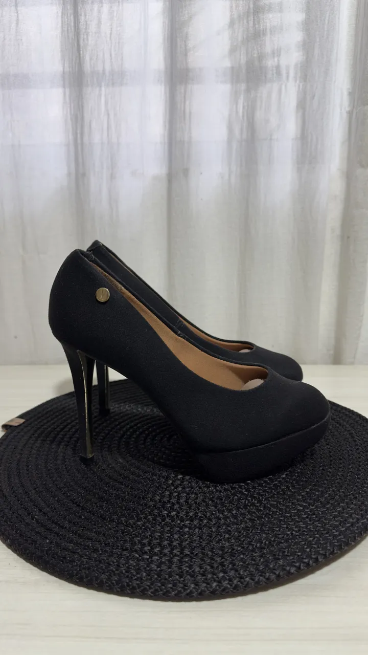 Zapatos de taco alto negros, con plataforma delantera y taco fino dorado. Tienen un detalle metálico dorado con el logo de la marca en el lateral.