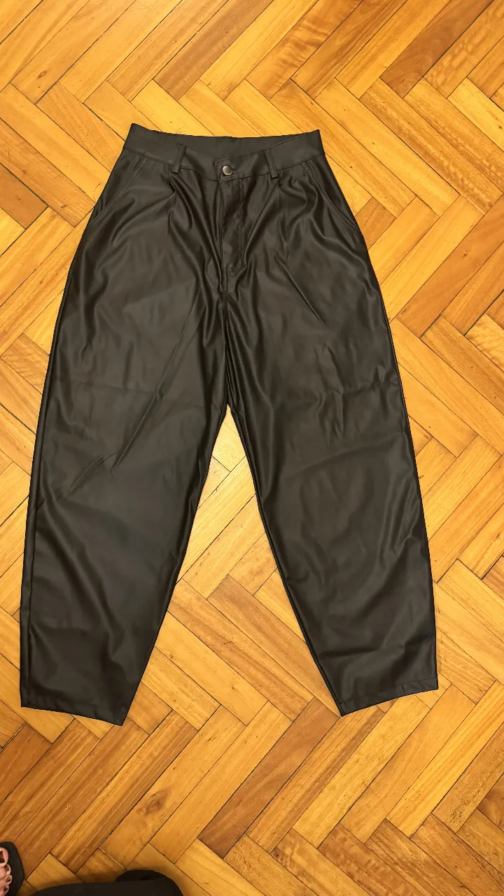 Pantalón de cuero sintético negro, tiro alto, con un corte ancho y moderno. Ideal para un look canchero y con onda.