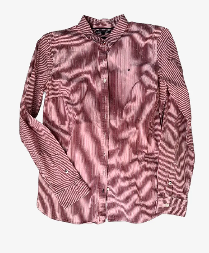 Camisa a rayas rojas y blancas, manga larga, con botones al frente. Ideal para un look Sporty Chic combinando prendas y accesorios que lo hacen casual y canchero. Importada, talle 10.