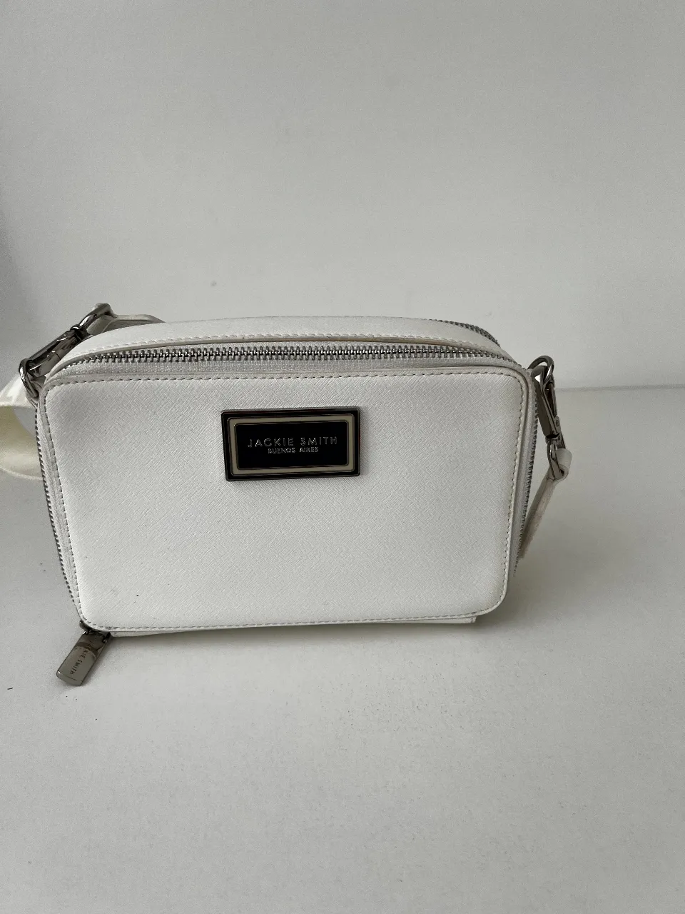 Cartera blanca de cuero sintético, con correa de tela estampada con el logo de la marca. Tiene dos compartimentos principales con cierre y varios bolsillos internos. Ideal para el día a día o para salir.
