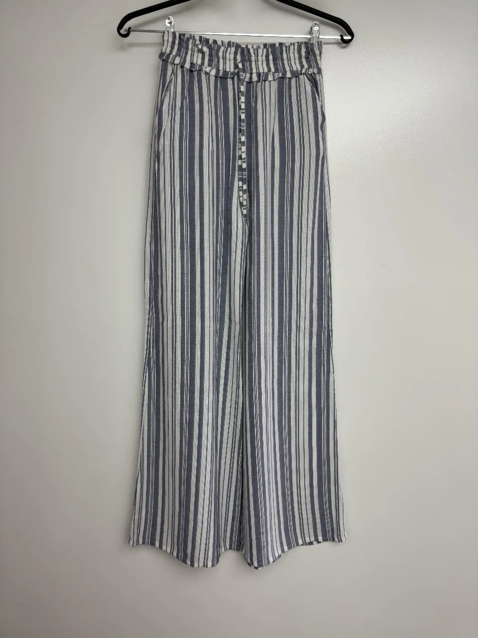 Pantalón ancho de lino a rayas verticales en blanco y gris. Posee cintura elastizada con cordón ajustable y detalles de botones en la parte delantera. Ideal para un look fresco y cómodo.