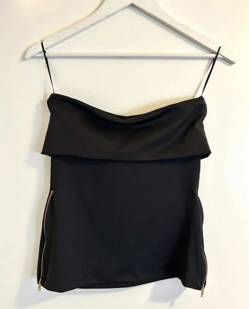 Top negro talle m de la marca n.a.m, en excelente estado, sin uso. Es strapless y es largo, cubre la panza. Se puede usar con los cierres tanto abiertos como cerrados (tiene uno en cada costado) mlo que hace que sea una prenda súper original y distinta.