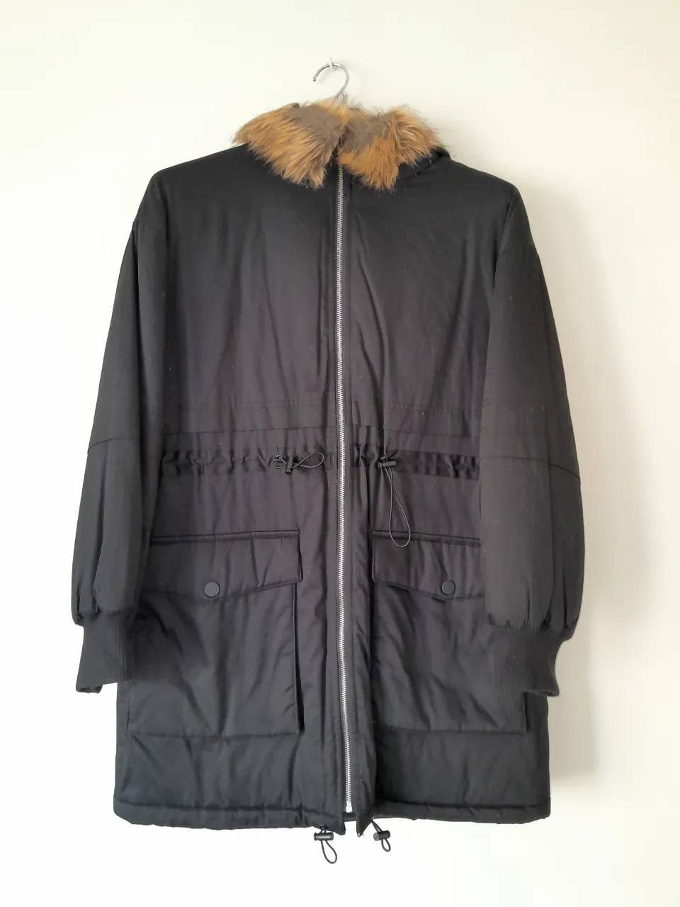 Campera negra larga con capucha de piel sintética. Tiene cierre frontal, cordones ajustables en la cintura y bolsillos con solapa.