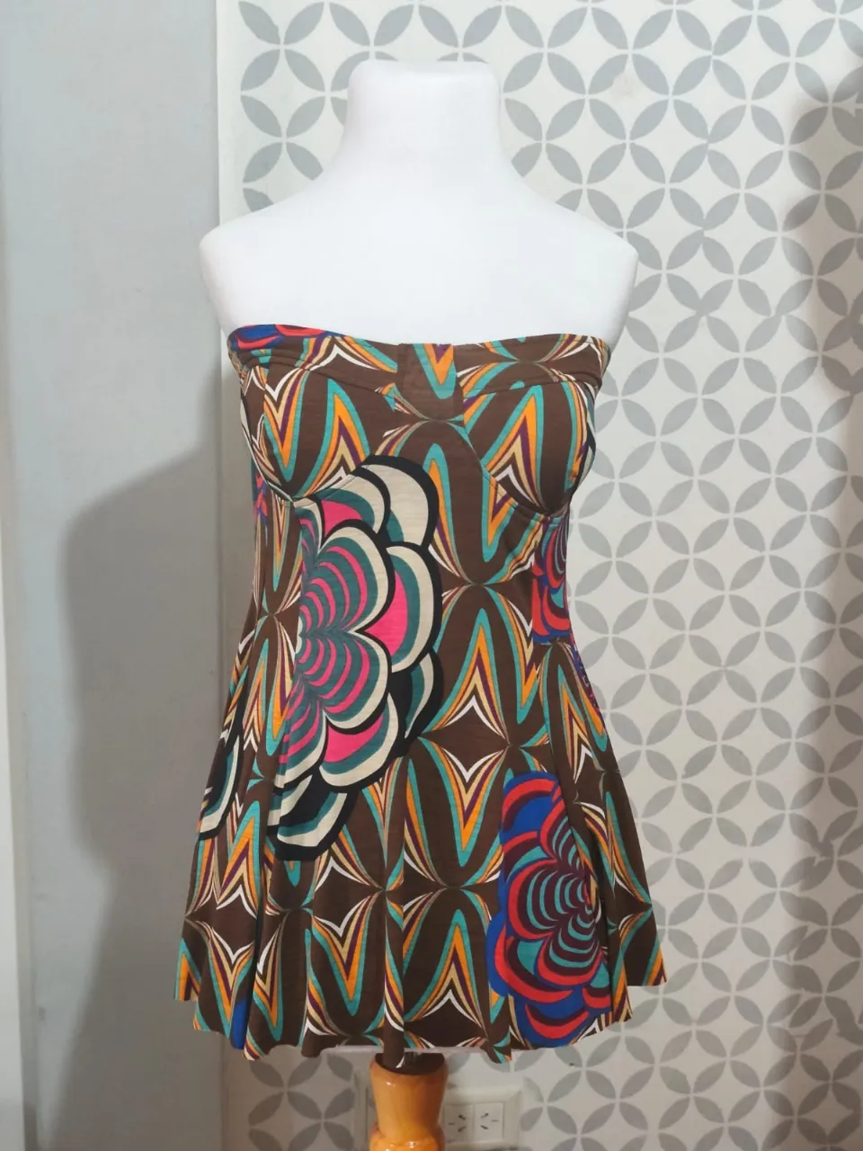 Top strapless con estampa psicodélica súper original y colorida. Ideal para un look divertido y canchero.