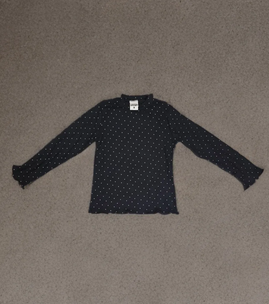 Remera de manga larga negra con estampa de lunares blancos. Cuello redondo y puños con volados.