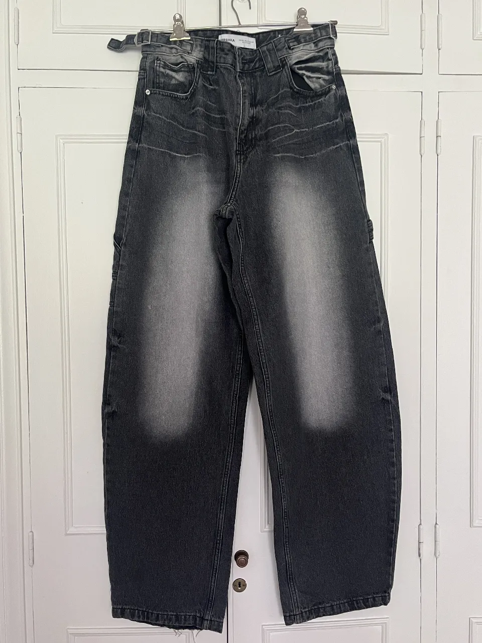 Jean ancho tiro alto con cinturón de tela, lavado oscuro con efecto desgastado. Un clásico del streetwear que no puede faltar en tu guardarropa.