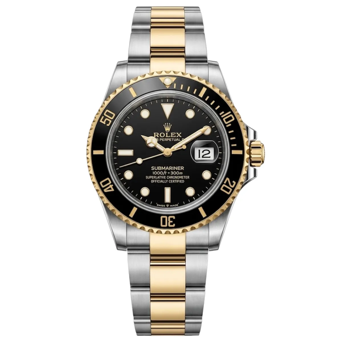 Reloj de pulsera con malla combinada en plateado y dorado. La esfera es negra con detalles en dorado y un fechador.