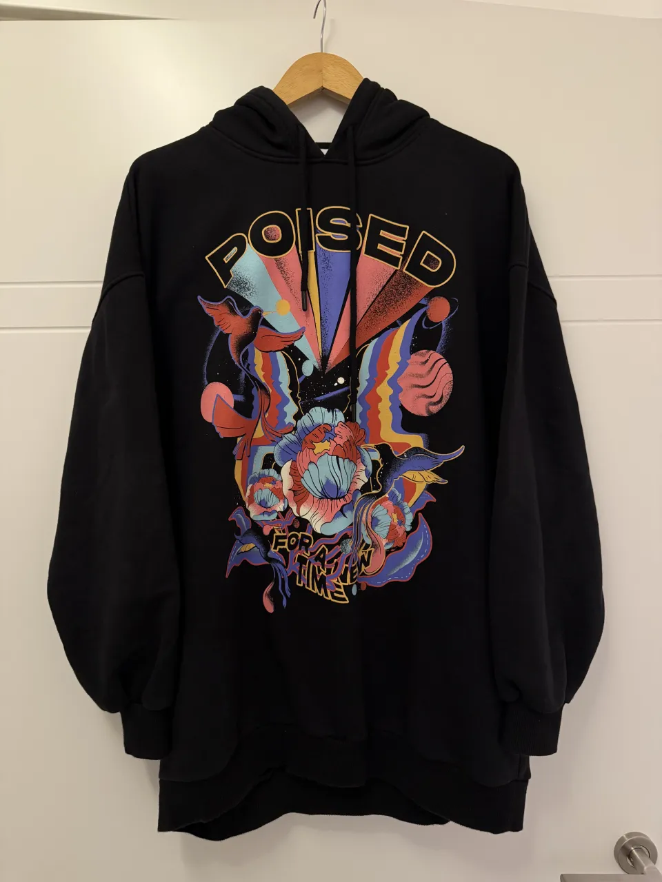 Buzo negro oversize con estampa gráfica colorida y abstracta en el frente. Diseño único con flores, pájaros y elementos cósmicos. Ideal para un look urbano y canchero.