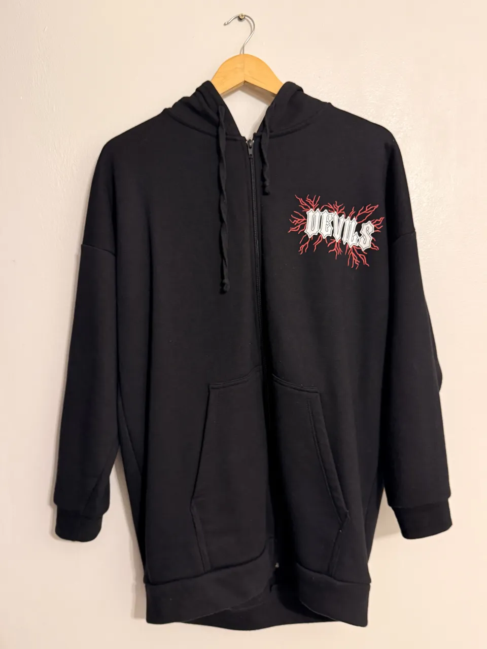 MEDIDAS: 61cm (de axila a axila) 73cm de largo. Es bien oversize y calentito. En buen estado. 🖤 Buzo oversize negro con capucha y cierre, estampado "DEVILS NOT ANGELS" en la espalda y logo en el frente. Ideal para un look urbano y canchero.