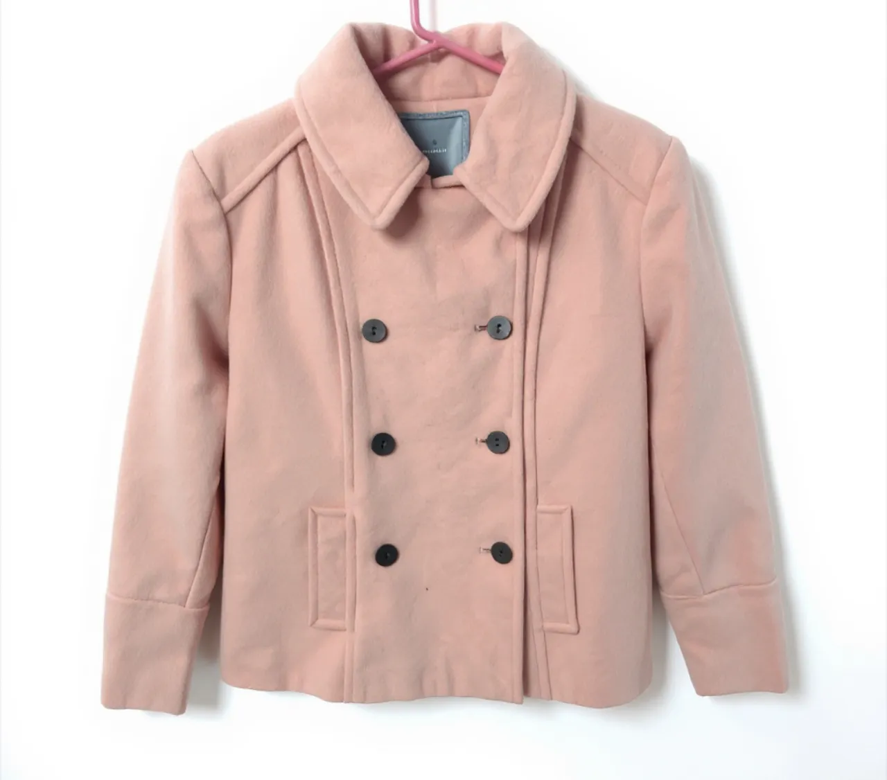 Abrigo rosa palo estilo marinero, con doble hilera de botones y cuello solapa