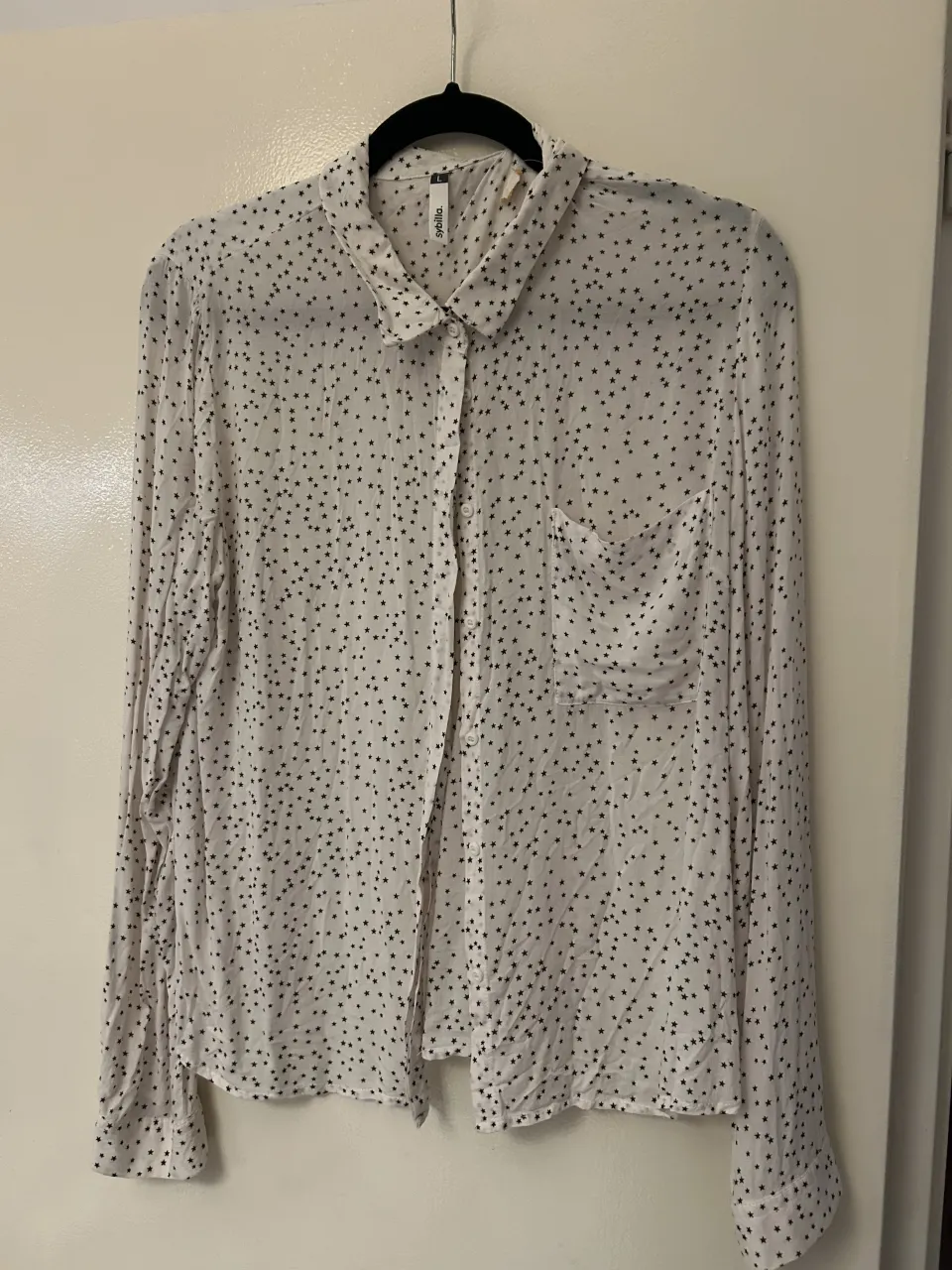 Camisa blanca con estampa de estrellas negras. Tiene cuello, botones al frente y un bolsillo en el pecho.