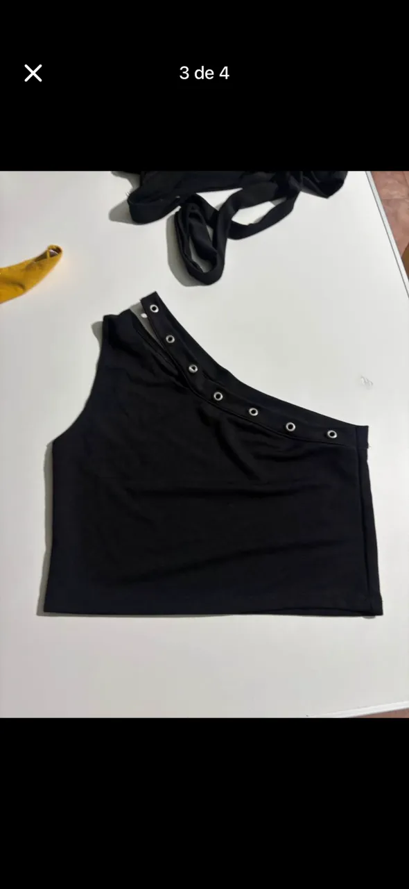 Top negro de un solo hombro con detalles de ojalillos metálicos en el escote.