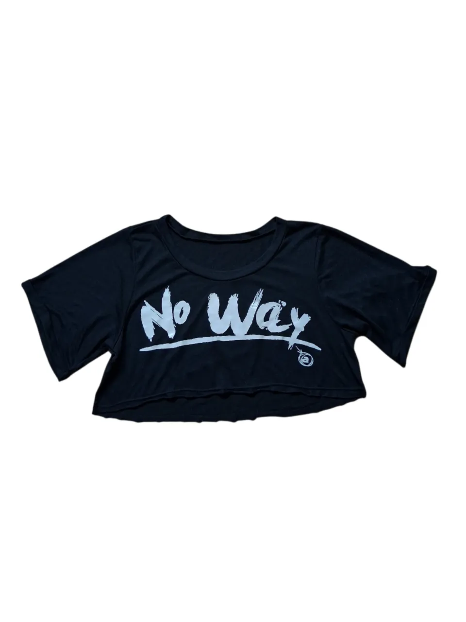 Remera negra crop con estampa "No Way". Cuello redondo y mangas cortas. Talle M. Medidas: axila a axila 48 cm, hombro a hombro 38 cm, largo 36 cm. Es elastizada.