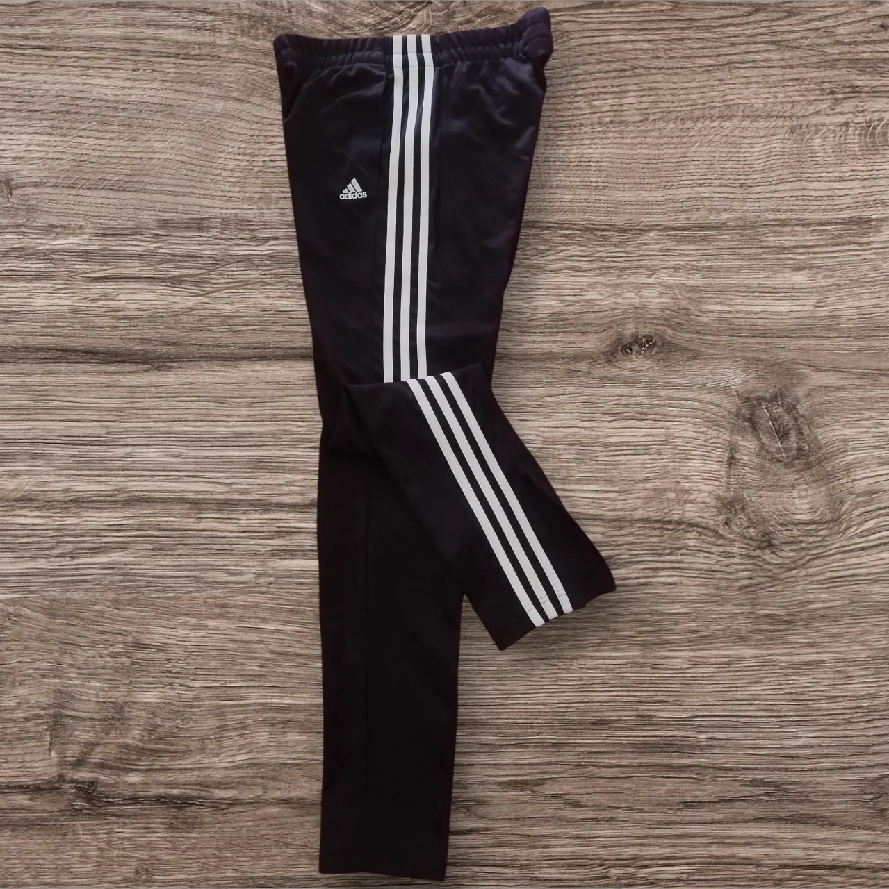 Pantalon deportivo Adidas negro con las tres tiras blancas icónicas. Ideal para entrenar o para un look casual y cómodo.