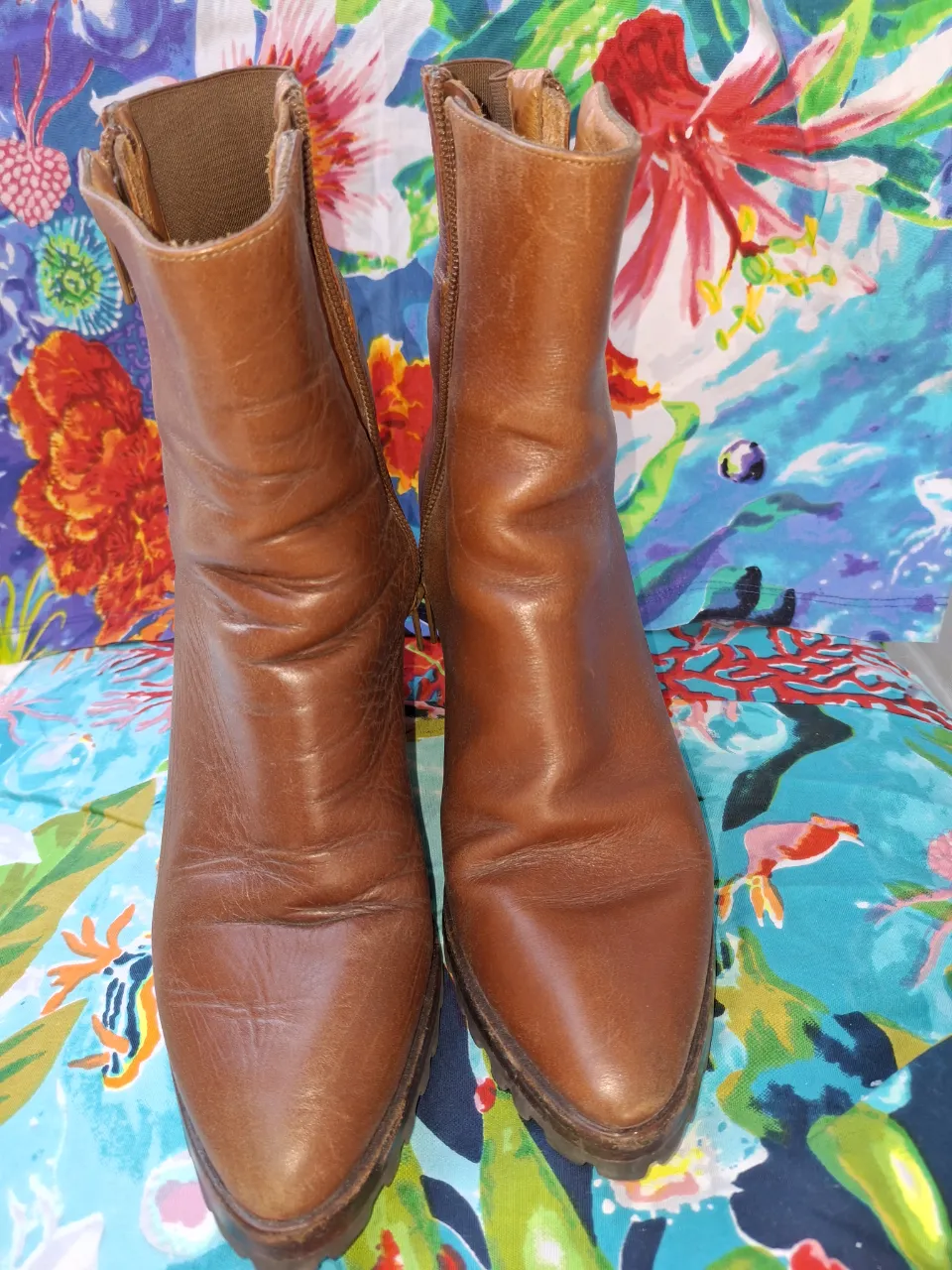 Botas de cuero color marrón con cierre lateral y elástico en la caña. Taco cuña.
