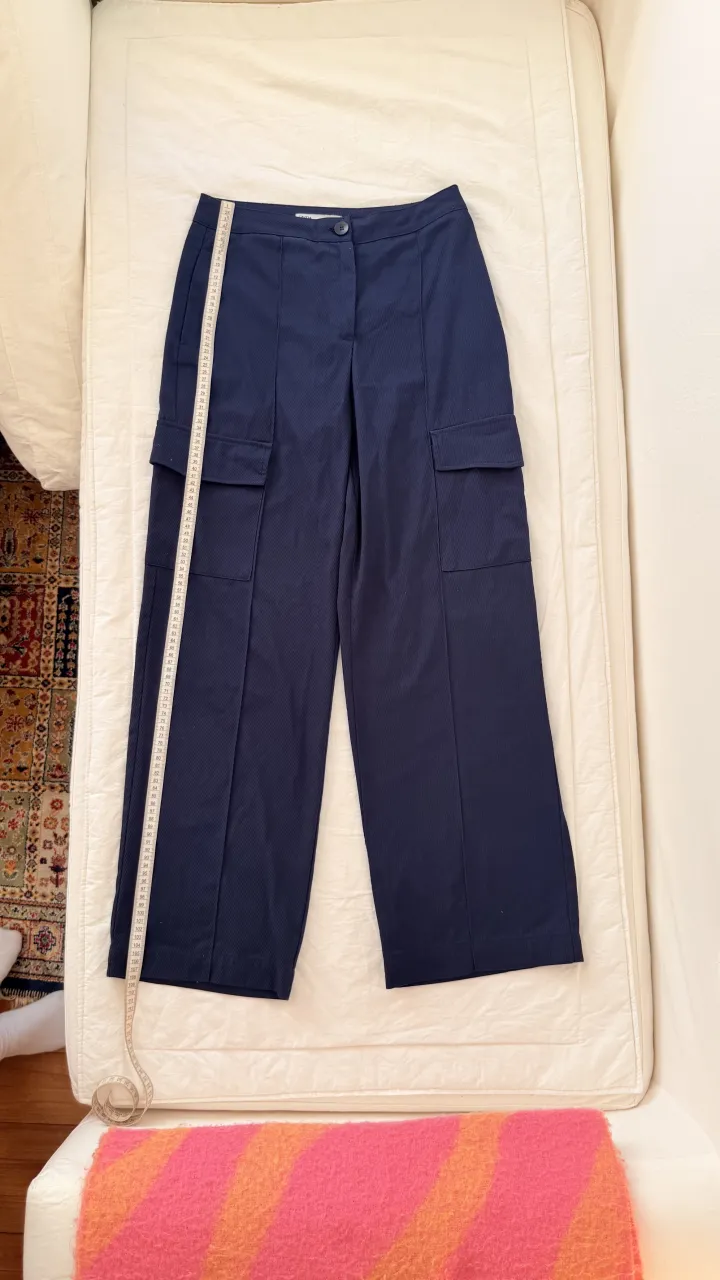 Pantalón de vestir azul marino con bolsillos cargo y pinzas. Cierre con botón.