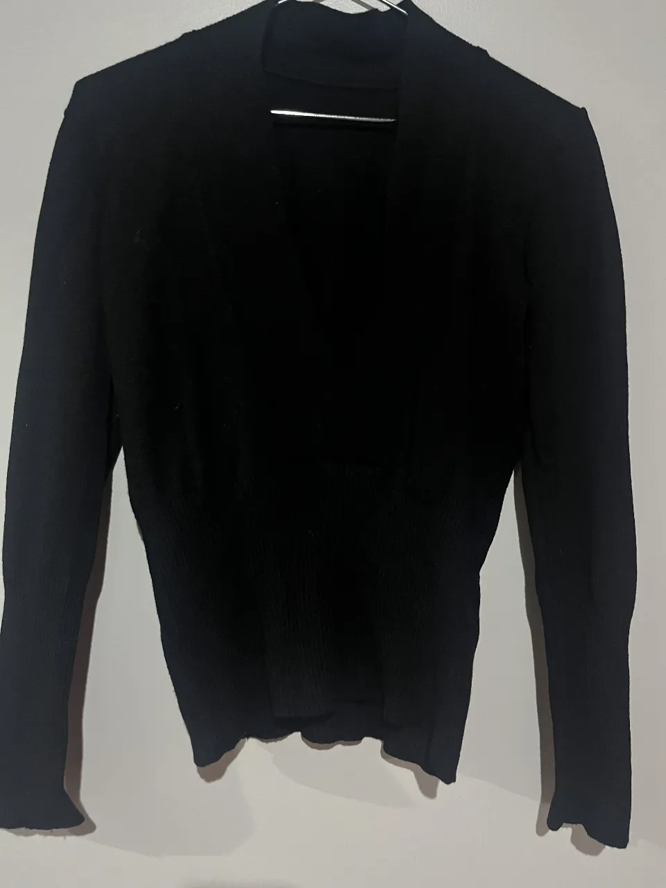 Sweater negro de manga larga con escote en V pronunciado. Tejido acanalado que se ajusta al cuerpo, ideal para un look elegante y moderno. Perfecto para usar solo o como base para otras prendas.