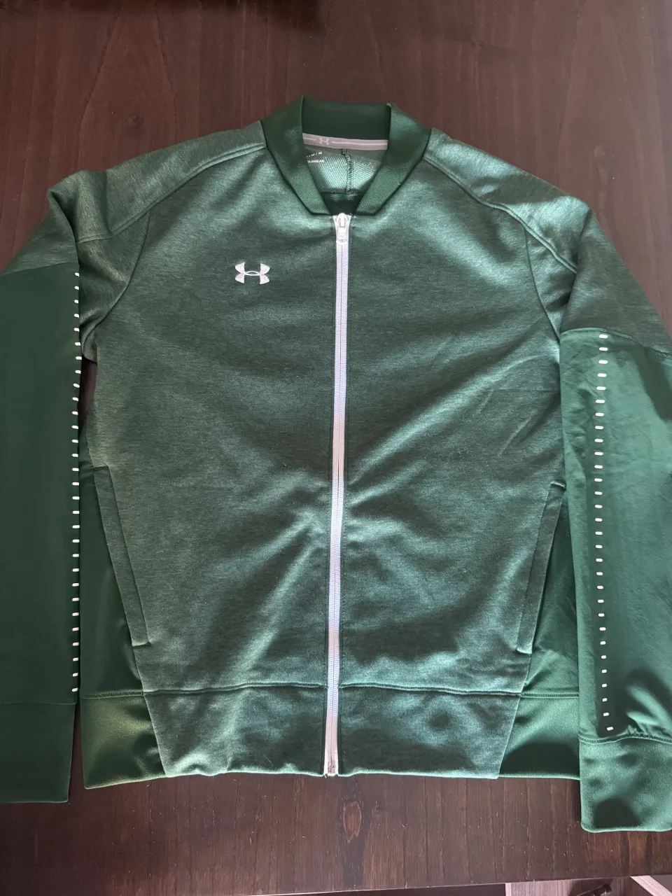 Buzo vintage verde con cierre completo y cuello redondo marca Under. Posee detalles de costuras blancas en las mangas y bolsillos laterales con cierre.