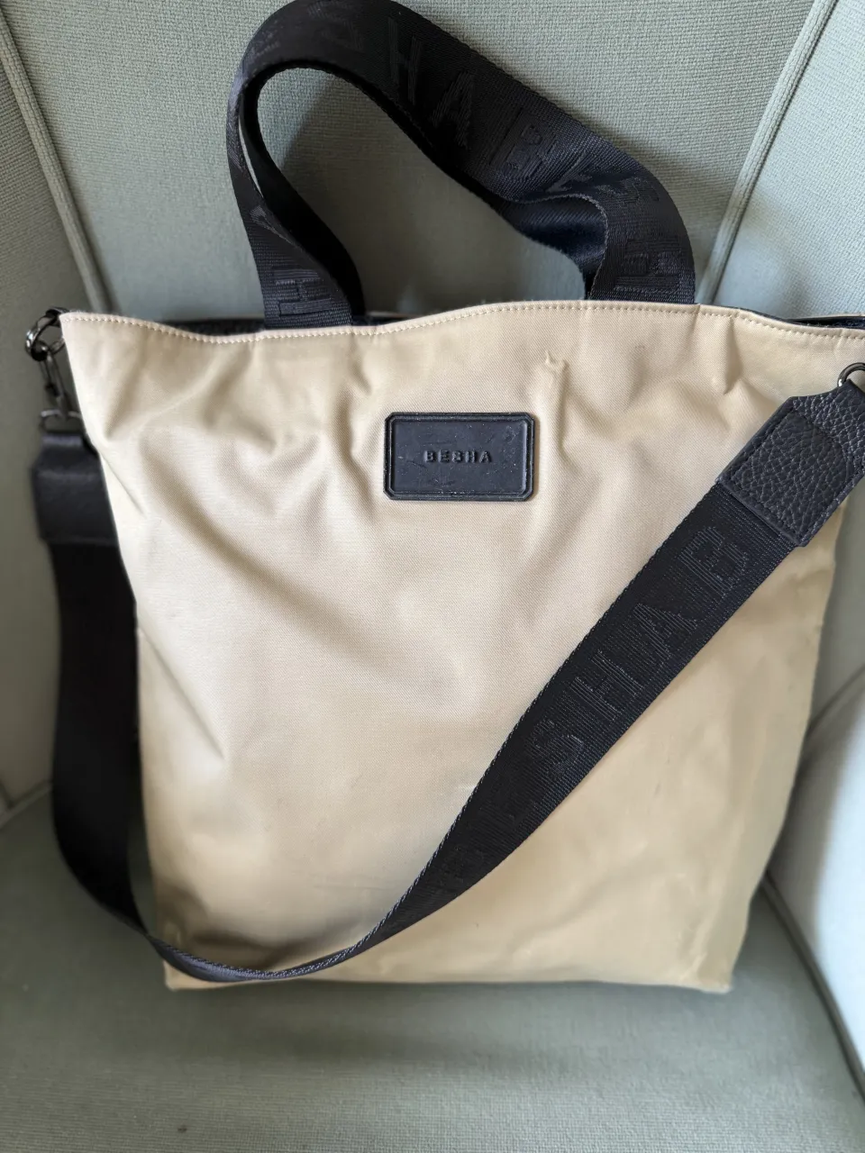 Bolso tote color crudo con detalles en negro. Tiene dos asas cortas y una correa larga regulable y desmontable, ambas con el logo de la marca tejido en negro. El cierre principal también tiene un detalle con el logo de la marca. El bolso tiene pequeños detalles en el reverso pero esta muy bien en gral (ver última foto)