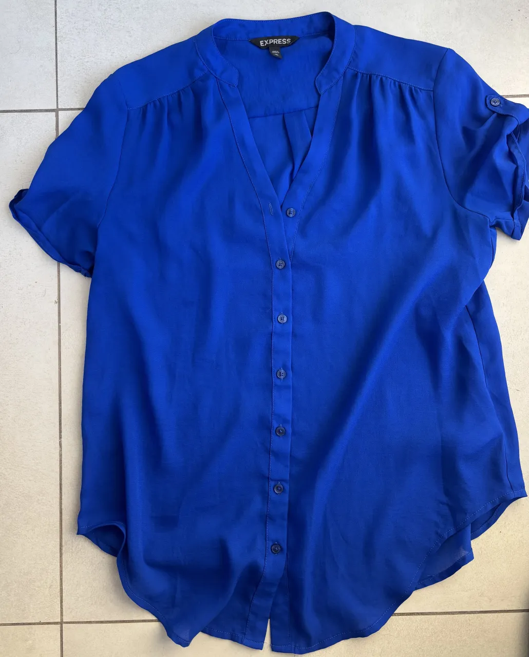 Remera azul vibrante con botones al frente y mangas cortas con detalle de doblez. Cuello escote en V con detalles de frunces sutiles. Perfecta para un look casual o para ir a la oficina.