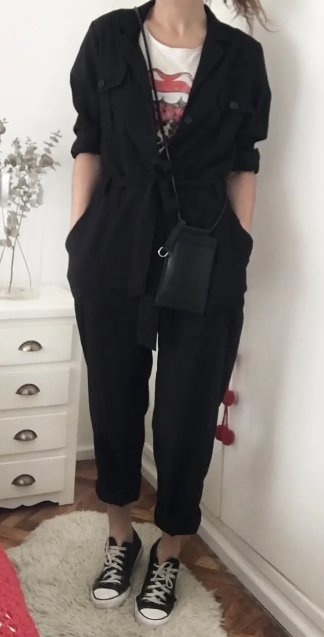 Mono negro de vestir, con cinturón de tela para anudar a la cintura. Posee bolsillos frontales y botones en los puños. Ideal para un look elegante y canchero.
