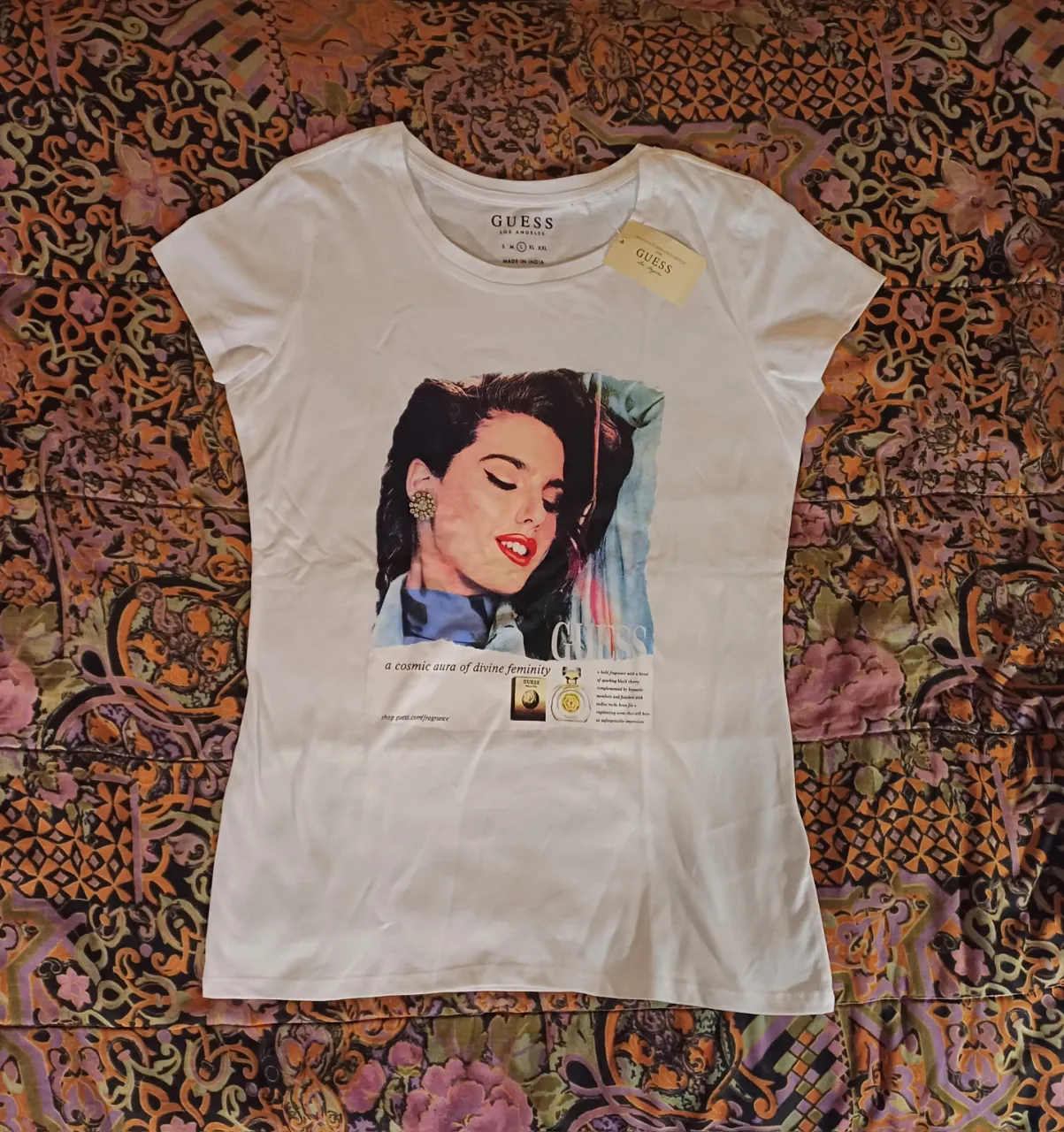 Remera blanca de manga corta con estampa de una mujer y texto "a cosmic aura of divine femininity". medidas: sisa a sisa: 45 cm Largo: 65 cm