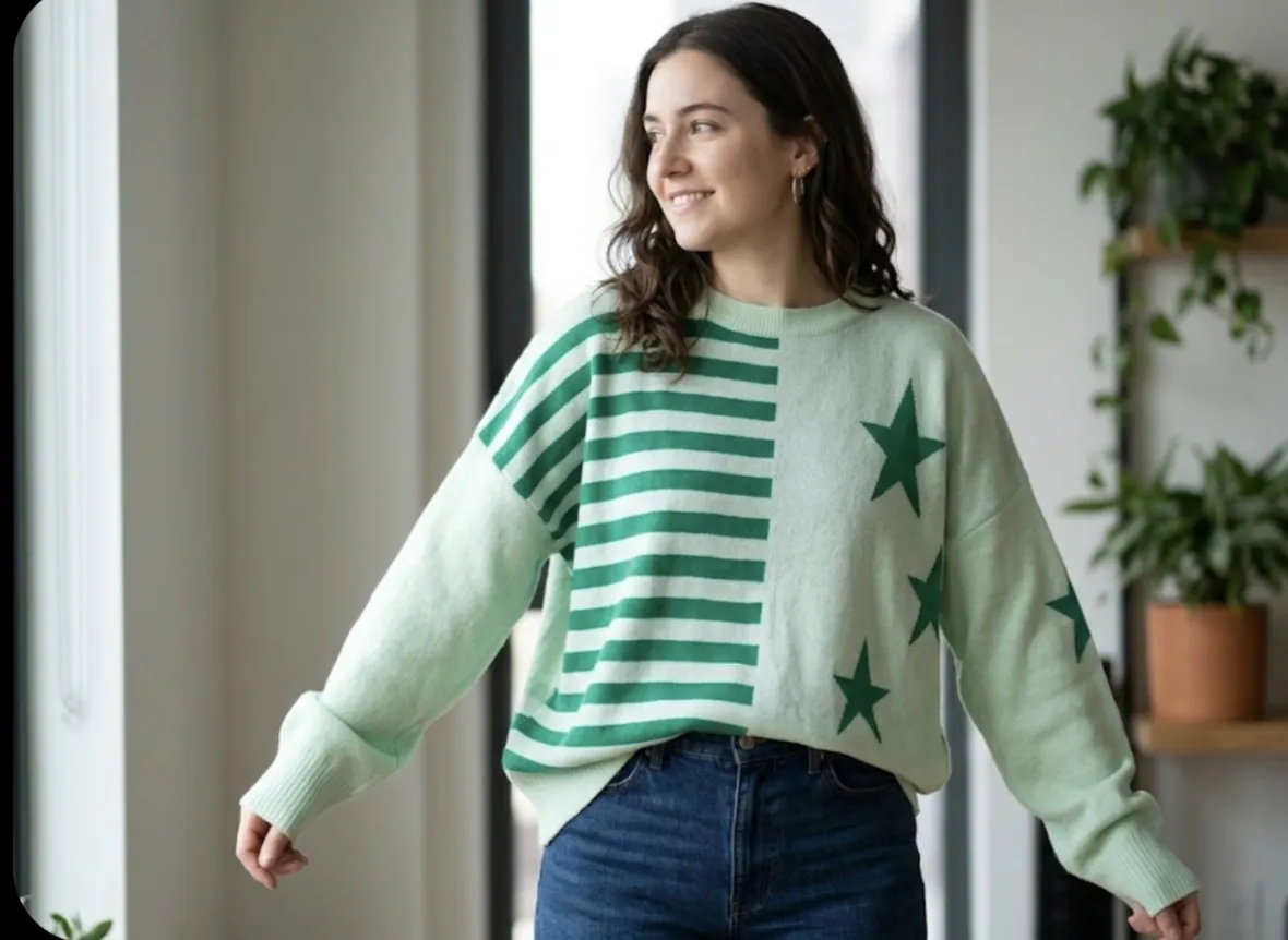 Sweater de tejido de punto con mangas largas. El frente de la prenda está dividido en dos secciones: una con rayas horizontales verdes y blancas, y la otra con estrellas verdes sobre fondo verde claro. El resto de la prenda es de color verde claro. Sisa a sisa 48 cm , largo 58 cm.