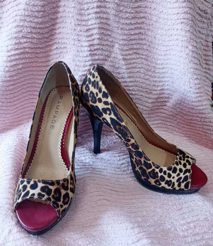 Zapatos de taco alto con estampa de leopardo y puntera abierta. Detalle en color bordó en la punta y taco negro. Marca rampage, excelente estado. taco 11 cm. plataforma escondida de aprox 3 cm.