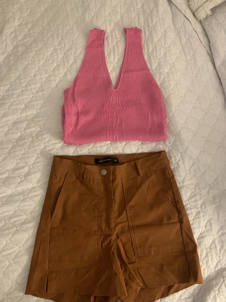 Conjunto de top rosa de tejido acanalado con escote pronunciado y shorts color suela con bolsillos cargo talle 40 . Ideal para un look casual y chic.