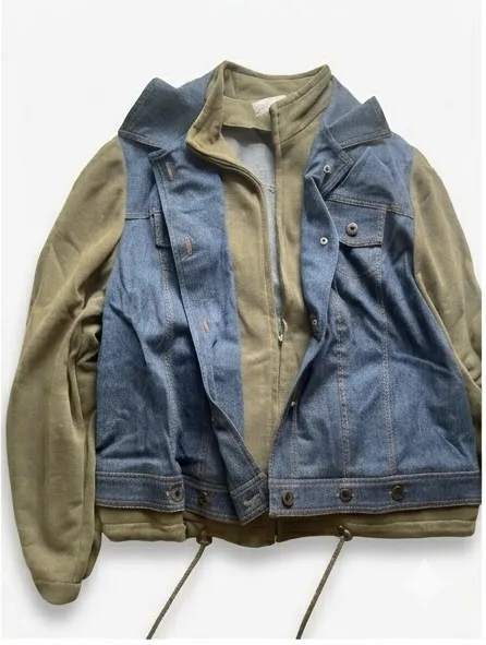 Campera de jean combinada con buzo. Diseño moderno y canchero, ideal para un look urbano y relajado. Combina la resistencia del denim con la comodidad del algodón.