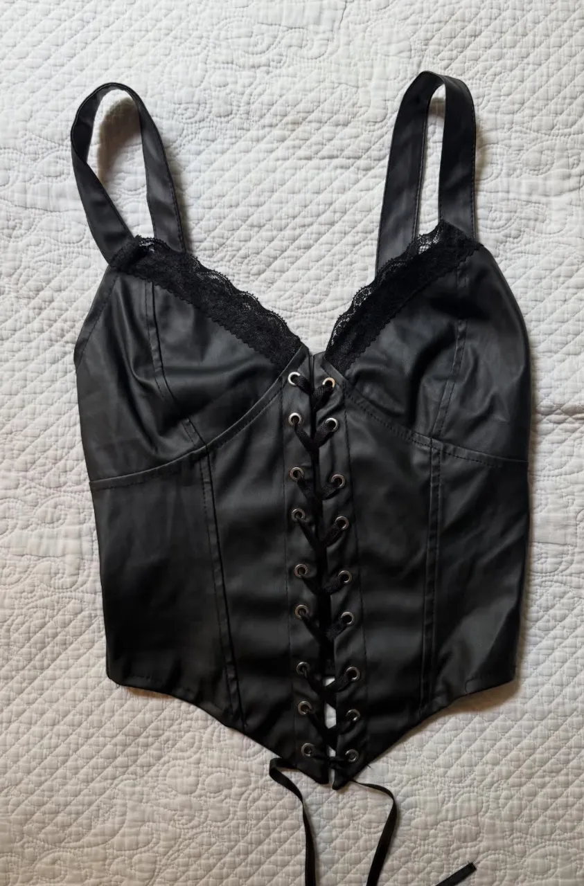 Top estilo corset negro, con detalles de encaje y cordones al frente.