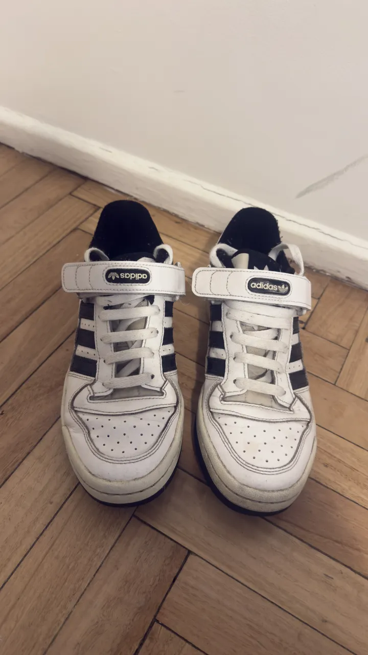 Zapatillas FORUM blancas y negras de Adidas con velcro y cordones.