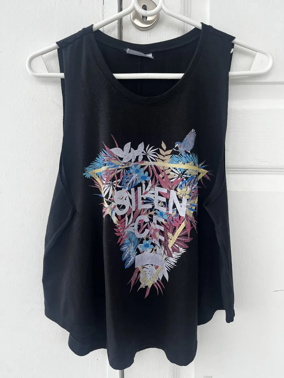 Musculosa negra con estampa triangular de flores y hojas en la parte delantera. La estampa tiene la palabra "SILENCE" en el centro.
