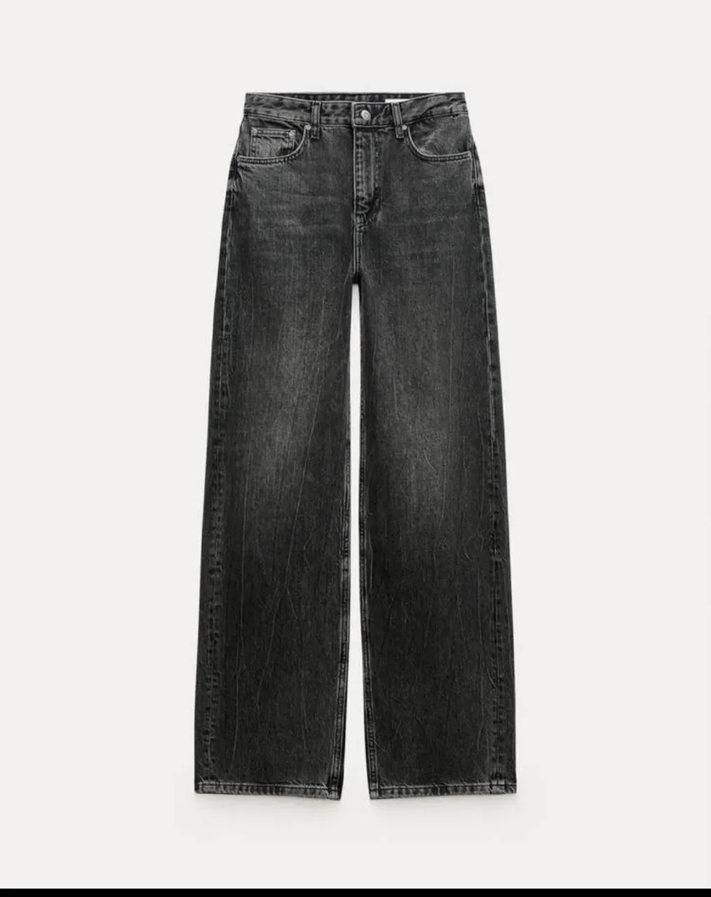 Jean de tiro alto, color gris oscuro con efecto desgastado. Modelo ancho en las piernas.