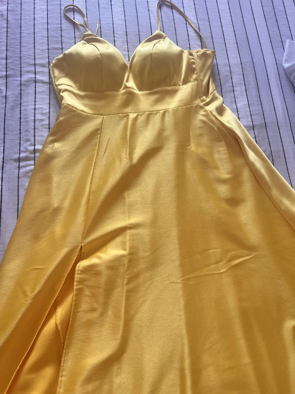 Vestido largo amarillo, de SATÉN, ideal para eventos especiales o fiestas. Posee un escote pronunciado en forma de corazón, tiras finas y una abertura lateral que le da un toque sensual. La espalda tiene un diseño de corsé con cordones para un ajuste perfecto. Su tela satinada y el color vibrante lo hacen destacar. tiene bolsillos