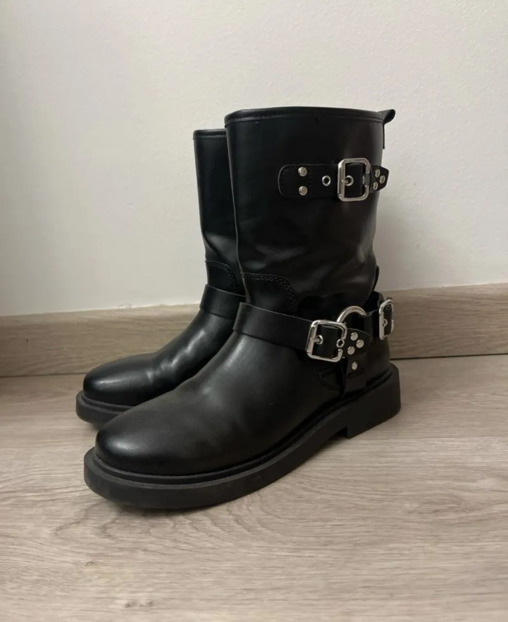 Botas Zara negras de cuero con hebillas y cierre lateral. Talle 36.