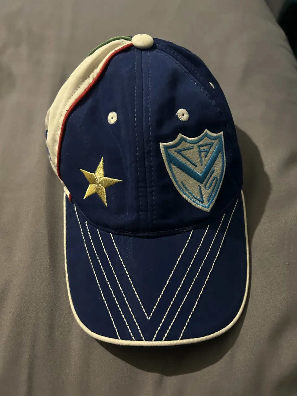 Gorra azul con detalles blancos y dorados. Tiene un escudo bordado en el frente y una estrella dorada en el lateral. En la parte trasera se lee "VELEZ SARSFIELD". original de la tienda