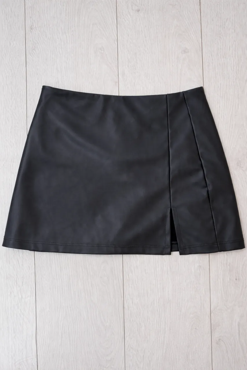 Mini falda de engomado con textura lisa, con tajito lateral. Detalle con cierre en la parte trasera.