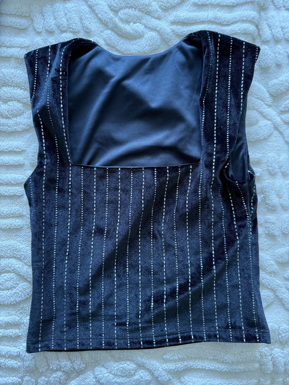 Top negro sin mangas con finas líneas verticales plateadas. Escote cuadrado. sin uso, el material es tipo terciopelo da para un 85 de busto