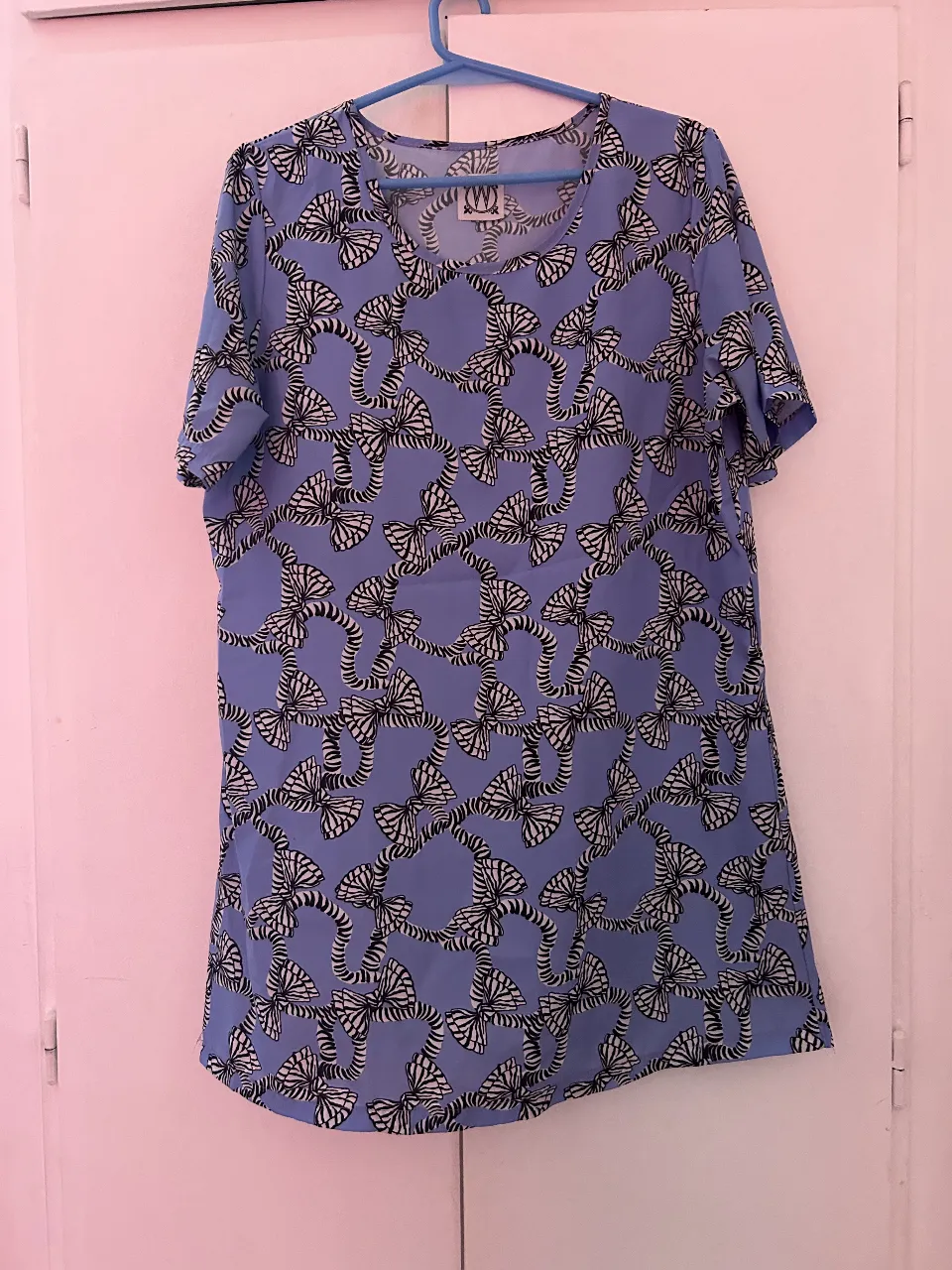Remera estampada con un diseño de moños en color azul lavanda. Ideal para un look casual y divertido.